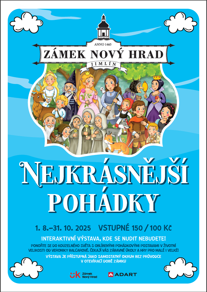 Zámek Nový Hrad Vás zve na interaktivní výstavu Nejkrásnější pohádky, kterou budete moci navštívit od 1.8. do 31.10. 2025 během otevírací doby zámku. Vstupné je 150 Kč pro dospělé, 100 Kč pro děti. Výstava je přístupná jako samostatný okruh bez průvodce.