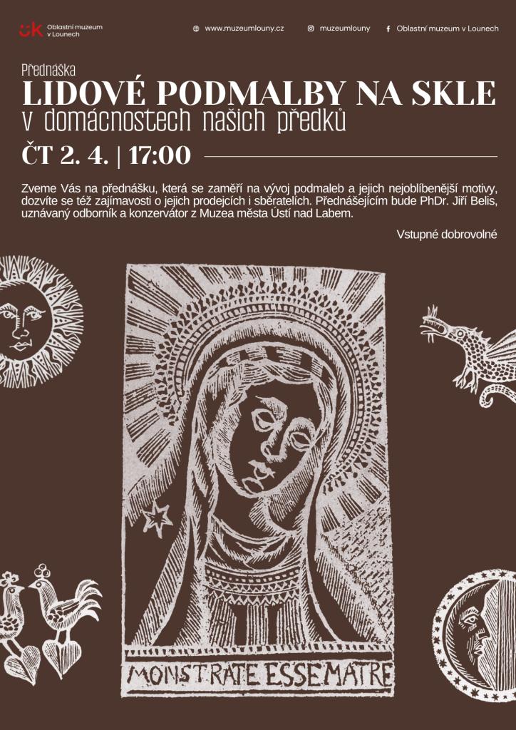 Oblastní muzeum v Lounech Vás zve na přednášku Lidové podmalby na skle v domácnostech našich předků, která proběhne ve čtvrtek 2. 4. 2026 od 17:00. Zaměří se například na vývoj a motivy podmaleb. Přednášejícím bude PhDr. Jiří Belis.