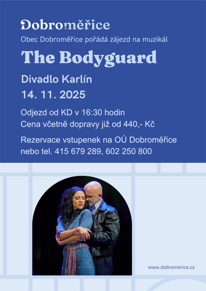 Obec Dobroměřice pořádá zájezd na muzikál The Bodyguard, který proběhne 14.11.2025 v divadle Karlín.